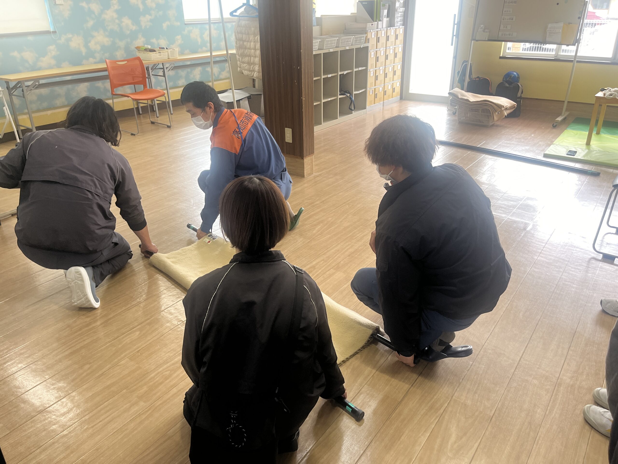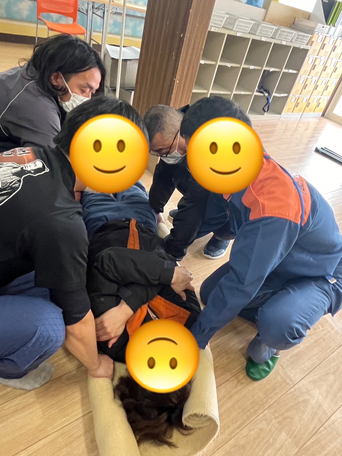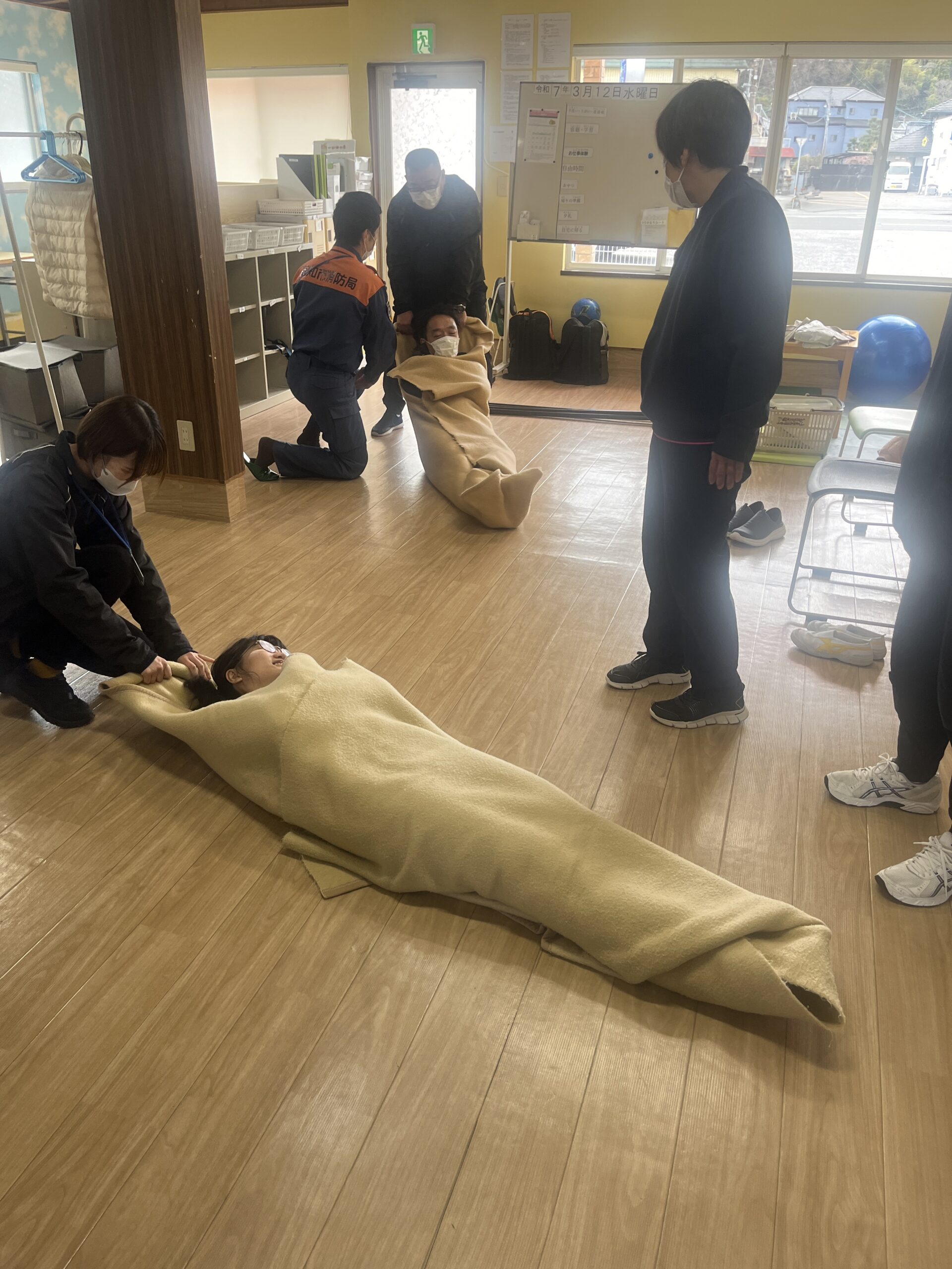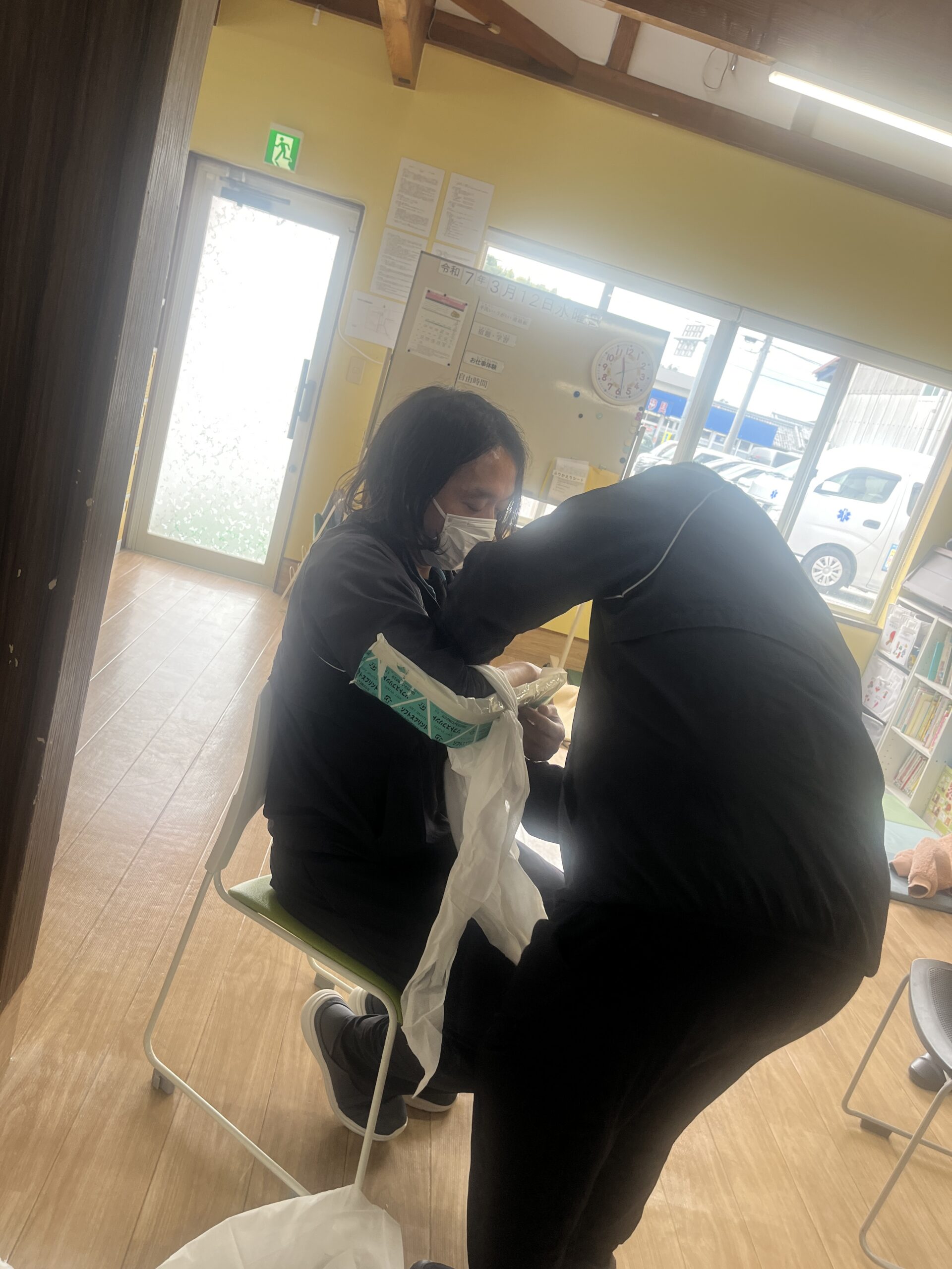実技では、保温の仕方、骨折時の固定の仕方、簡易担架の作り方(搬送)について行いました。